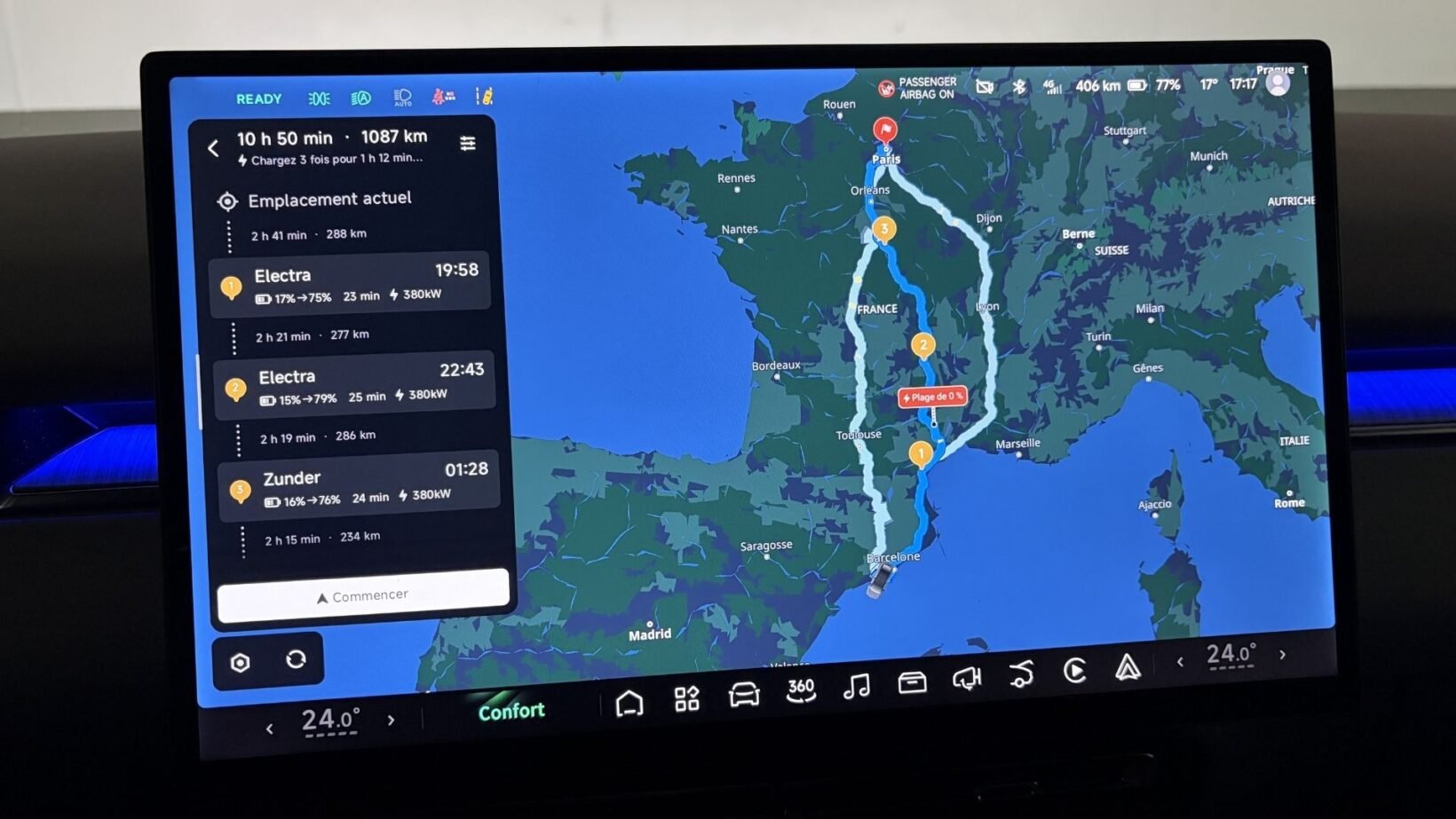 L’écran principal de la P7+ est détaillé avec un dessin très réussi. En témoigne le planificateur très complet, comme on peut le voir sur la photo ci-dessous, ou encore l’intégration de CarPlay qui peut être affiché en plein écran ou en mode fenêtré à côté de l’interface de Xpeng. Enfin, tout est d’une fluidité sans faille grâce à la nouvelle puce Turing développée par Xpeng et qui se veut plus puissante que celle de Nvidia qui faisait référence jusqu’à présent.