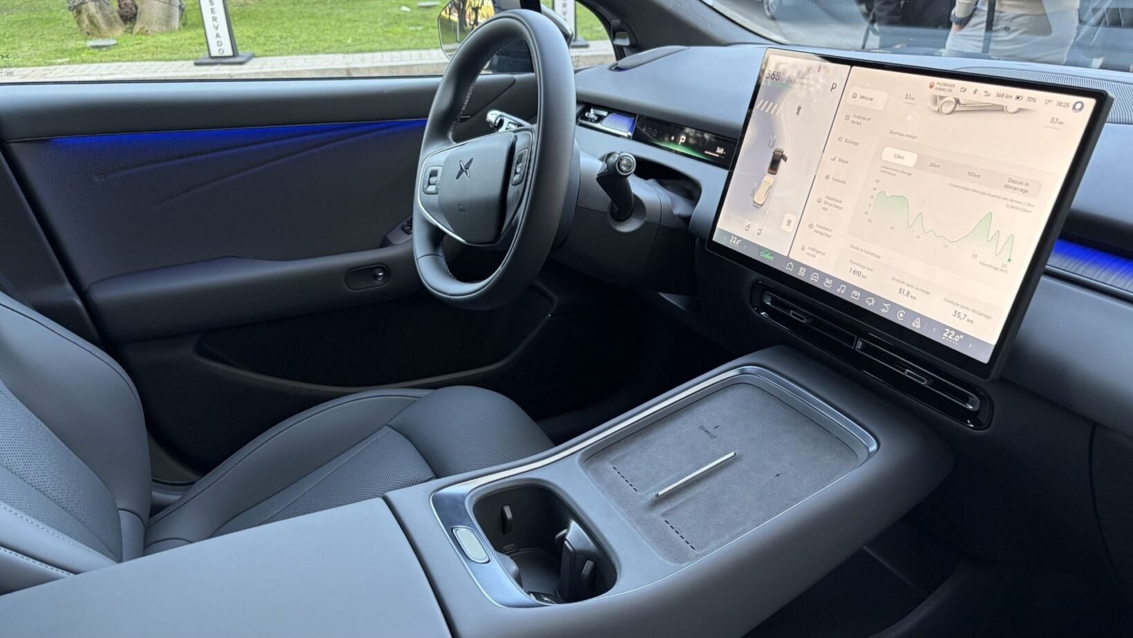 Surtout, la Xpeng P7+ met tout le monde d’accord au moment de recharger sa batterie. Arrivés à une borne Fastned, nous avons constaté que la fonction de préconditionnement de la batterie n’était pas activée. Qu’importe, la voiture a réussi à tirer à 357 kW de puissance sur les 446 kW annoncés par le constructeur (350 kW pour la version d’entrée de gamme). Bilan des courses : notre P7+ Propulsion Grande Autonomie a vu sa capacité passer de 26% à 80% en neuf minutes seulement. À peine le temps d’aller aux toilettes et de prendre un café ! Et, à 80%, la borne affichait toujours une puissance de charge de 196 kW.