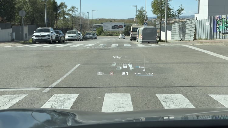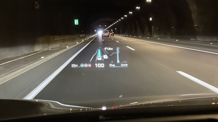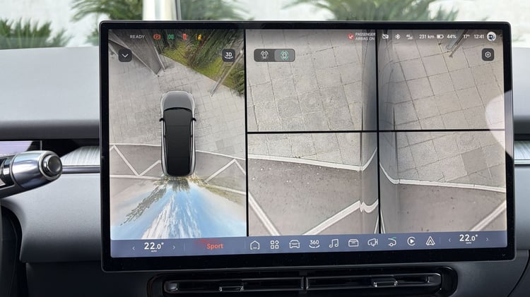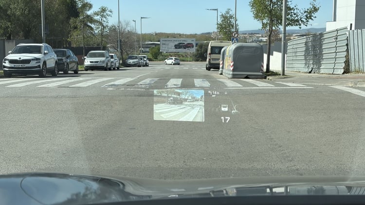 Mais la Xpeng P7+ propose également un affichage tête haute parmi les plus complets aujourd’hui, en plus d’être vraiment très grand. En effet, non content d’afficher les données habituelles dans le champ de vision du conducteur (y compris la navigation du GPS avec un niveau de détail conséquent), il offre des fonctionnalités inédites avec l’image des caméras latérales en activant les clignotants, celle des caméras avant et arrière lors des manœuvres de stationnement, ou encore les places disponibles alentours pour le stationnement automatique. Cette dernière fonctionnalité est d’ailleurs plutôt efficace, même si on attendra un test plus poussé dans les rues exiguës de la capitale, par exemple.