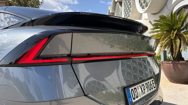 Les passages de roues accueillent des jantes de 20 pouces sur notre modèle d’essai (19 pouces sur la version de base), et une monte Michelin Pilot Sport. Rien ne vient perturber la ligne sur les flancs, pas même les poignées de portes qui sont bien sûr affleurantes. Derrière la ligne de toit plongeante, l’arrière est plus sculpté avec un béquet intégré au hayon du coffre. Coffre dont le bouton d’ouverture est intégré très (trop) bas, sous le support de la plaque d’immatriculation. Relativement basse, à 1 512 mm, la Xpeng P7+ affiche des dimensions conséquentes avec 1 937 mm de large et surtout 5 071 mm de long. En contrepartie, l’empattement de 3 000 mm promet une belle habitabilité.