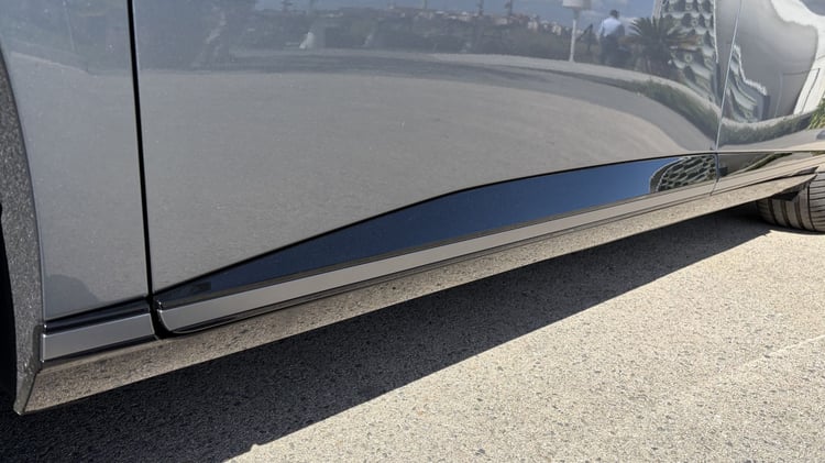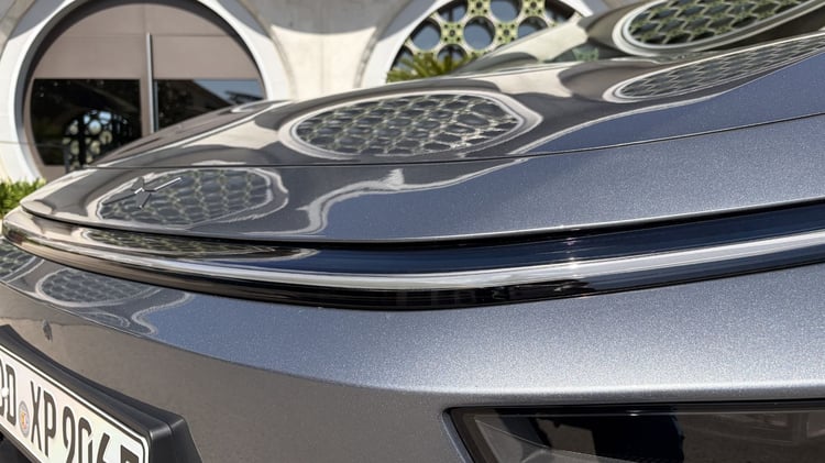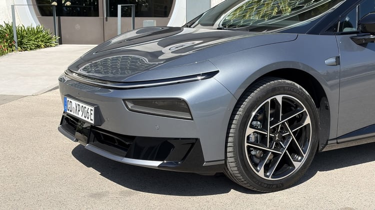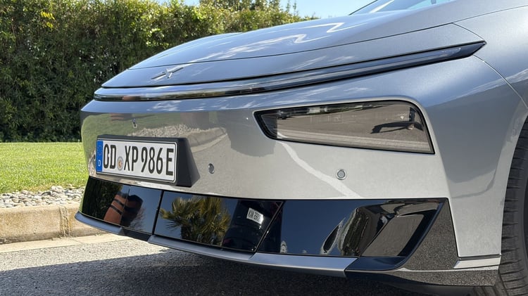 En matière de design, la Xpeng P7+ n’est pas sans rappeler la G6 au niveau de sa face avant. Épurée mais surtout très basse et large, elle mise clairement sur l’aérodynamique, ce qui se traduit d’ailleurs dans les faits par un coefficient de traînée de 0,211. La partie inférieure accueille aussi des volets dynamiques et arbore une finition « piano black » qu’on retrouve aussi sur les bas de caisse et le diffuseur arrière. Ce choix permet d’affiner la ligne de la voiture mais le choix de ce matériau, qui équipait tous les téléviseurs plats au début des années 2000, sur des parties aussi sensibles n’est pas sans risque, notamment de rayures.