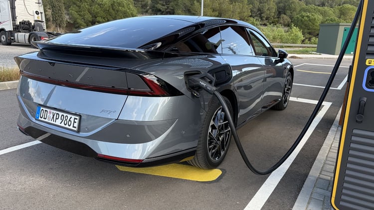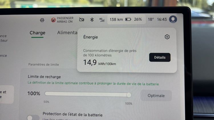 En matière d’autonomie, Xpeng a opté pour une batterie de moindre capacité face à une Mercedes CLA ou la Volkswagen ID.7. Quand ces dernières annoncent plus de 700 km d’autonomie, la P7+ se contente de 455 km en entrée de gamme à 530 km pour notre version à l’essai. En effet, comme en témoignent nos relevés de consommation (14,9 kWh/100 km en roulant aux limites de vitesse sur un trajet qui comprenait environ 30% d’autoroutes à 120 km/h max) et en attendant l’impitoyable Supertest de Soufyane, la berline sait se montrer sobre pour enchaîner les kilomètres.