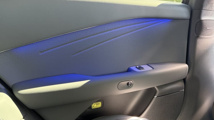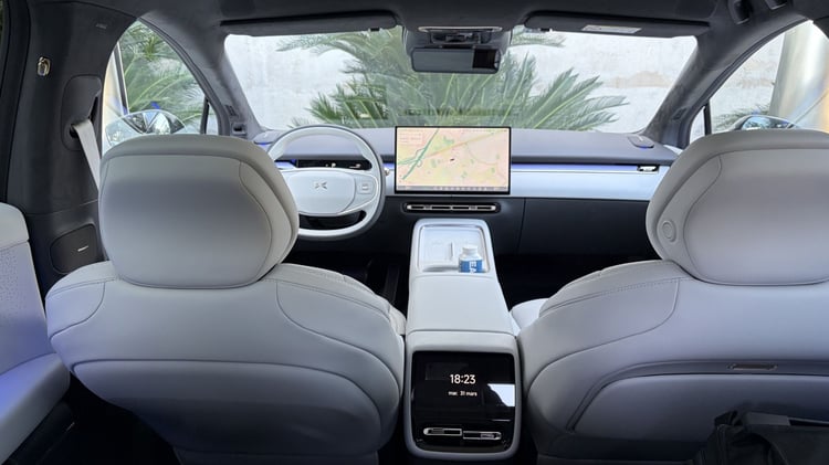 À l’arrière, justement, la Xpeng P7+ se la joue limousine en choyant les passagers. Ces derniers disposent d’un espace généreux pour les jambes qu’on pourra aisément étendre. Dommage que l’implantation très basse des sièges avant empêche de glisser les pieds en dessous. Contrairement aux Tesla récentes, l’écran dédié aux places arrière se limite au réglage de la climatisation et des sièges, ainsi qu’à la radio. Pas de Netflix ni de Youtube pour le moment, mais une mise à jour OTA (Over The Air) pourrait très bien les ajouter par la suite. En revanche la partie audio se la joue studio sur roues avec pas moins de 20 haut-parleurs, dont deux dans l’appui-tête conducteur.