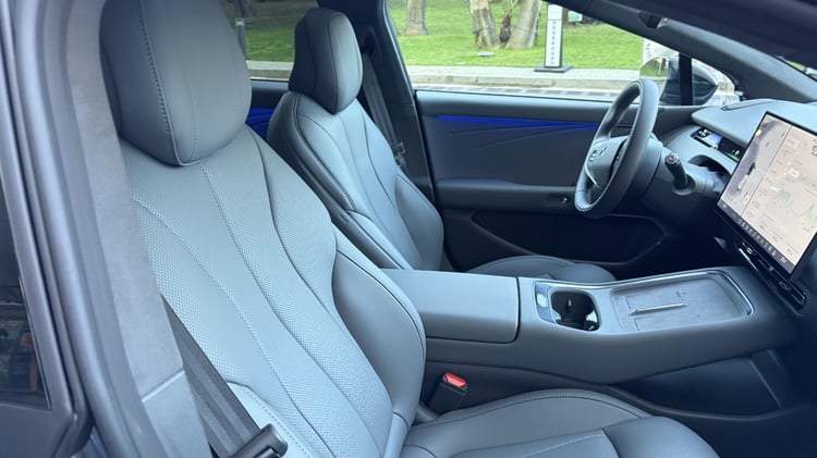 À l’instar de la G6, l’habitacle de la Xpeng P7+ est digne des marques premium. Épuré, il s’articule autour de l’écran tactile de 15,6 pouces comme c’est désormais la norme chez les constructeurs chinois. Point d’écran dédié au passager avant, qui fait face à une planche de bord dépourvue du moindre bouton.
