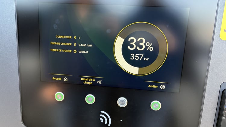 Surtout, la Xpeng P7+ met tout le monde d’accord au moment de recharger sa batterie. Arrivés à une borne Fastned, nous avons constaté que la fonction de préconditionnement de la batterie n’était pas activée. Qu’importe, la voiture a réussi à tirer à 357 kW de puissance sur les 446 kW annoncés par le constructeur (350 kW pour la version d’entrée de gamme). Bilan des courses : notre P7+ Propulsion Grande Autonomie a vu sa capacité passer de 26% à 80% en neuf minutes seulement. À peine le temps d’aller aux toilettes et de prendre un café ! Et, à 80%, la borne affichait toujours une puissance de charge de 196 kW.