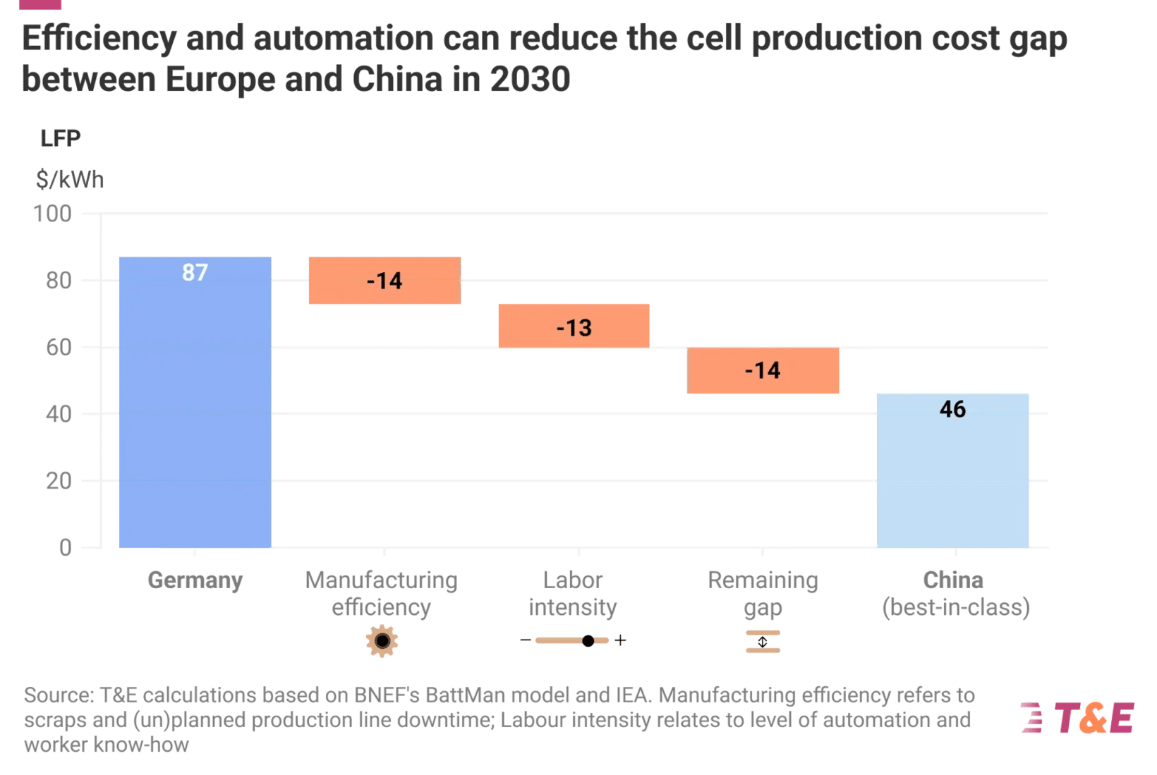 T&E estime que les progrès industriels (baisse des taux de rebut, amélioration du savoir-faire, automatisation accrue) pourraient ramener l’écart de coût à environ 14 dollars/kWh en 2030 entre l’Europe et la Chine, contre 41-43 dollars aujourd’hui. Cela représenterait un surcoût de 500 euros en moyenne, avec des variations allant de 300 à 750 euros selon les modèles. Un montant qui pourrait être partiellement compensé par des dispositifs publics, mais qui resterait perceptible pour les ménages européens.