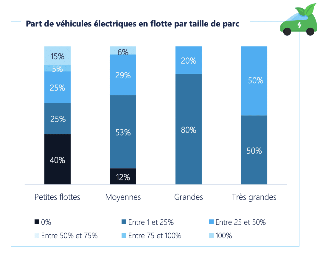 Mais alors, quelle est la part des électriques dans les flottes d’entreprises en 2025 ? L’Avere-France a réalisé une cartographie intéressante qui donne une idée de l’état actuel de l’électrification du parc chez les professionnels. À ce jour, on constate que très peu d’entreprises sont passées totalement à l’électrique. La majorité d’entre elles possède entre 1 et 25 % modèle électrique. Notons l’effort des « très grandes » flottes (+ de 10 000 véhicules) qui possèdent entre 25 et 50 % de véhicules électriques.