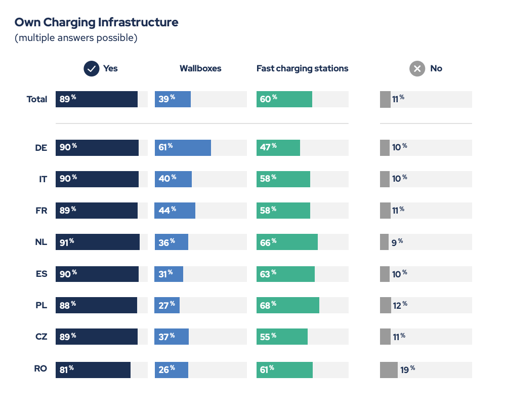 L’étude rappelle que le rythme de la transition dépend en grande partie des infrastructures disponibles. Sur ce point, les entreprises qui ont déjà franchi le pas misent d’abord sur leurs propres solutions. On voit que 89 % d’entre elles disposent déjà de bornes de recharge sur site. En France, 40 % des entreprises interrogées disposent des Wallbox, tandis que 58 % ont installé des bornes rapides. Une majorité prévoit même de renforcer leurs équipements à court terme, preuve que cette solution permet de sécuriser l’usage des véhicules électriques au quotidien.