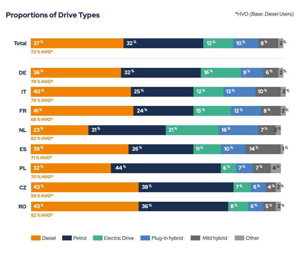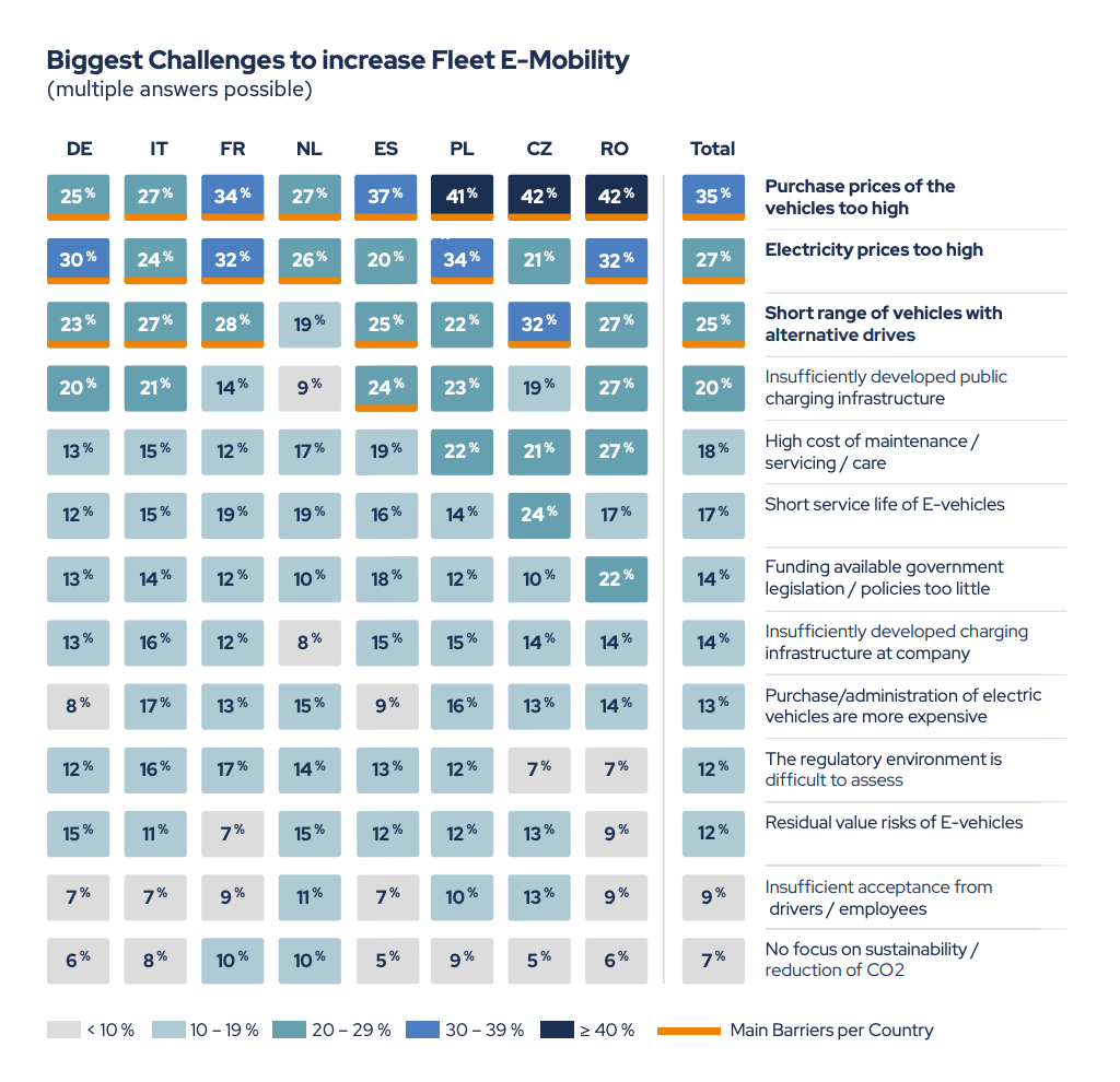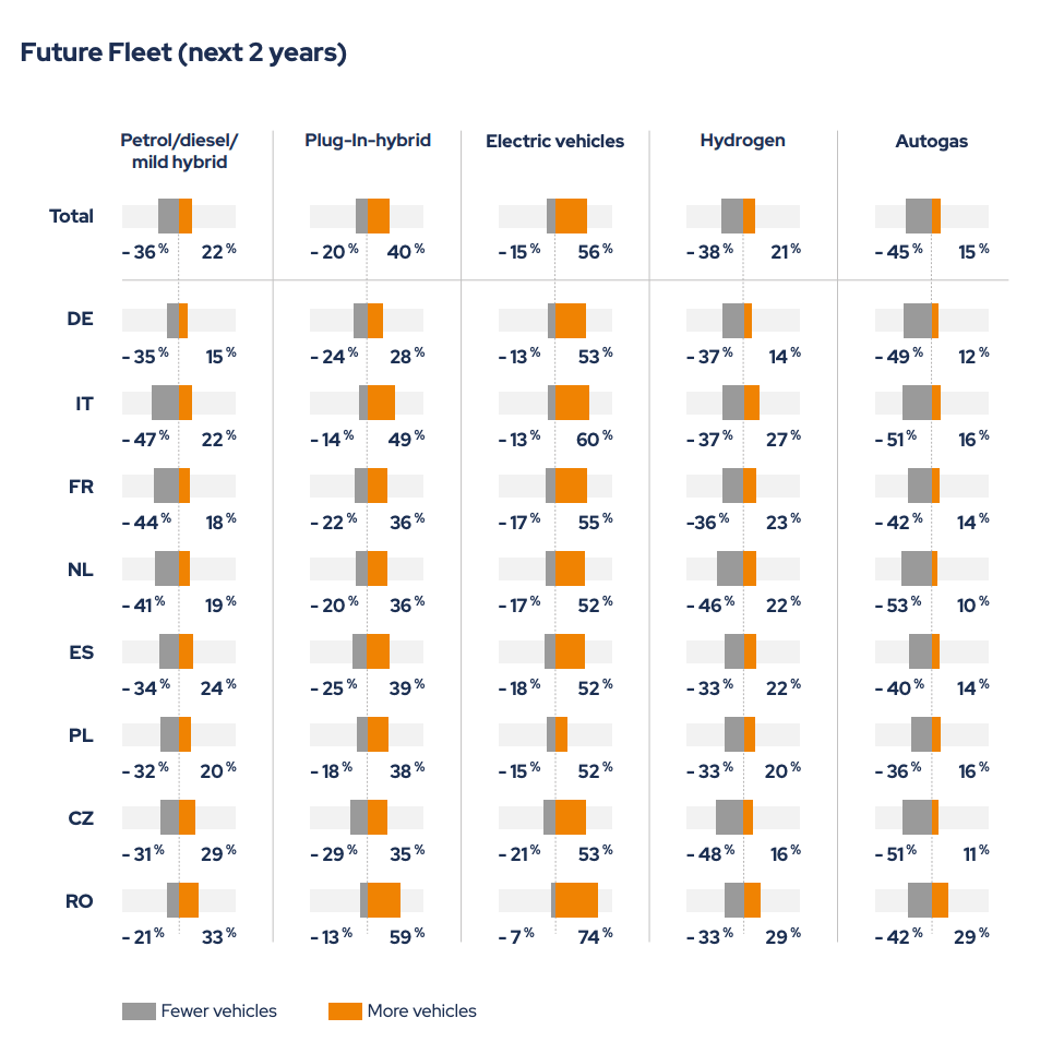 Quand on demande aux gestionnaires de flottes s’ils comptent acheter de nouvelles voitures électriques lors des deux prochaines années, les réponses sont encourageantes. En effet, 56 % des répondants disent qu’ils le feront. On est à 55 % pour la France ou encore à 74 % du côté de la Roumanie, ce qui en fait le pays le plus ambitieux en la matière si on se fie aux résultats de l’étude. Seules 22 % des entreprises prévoient d’acheter encore des voitures thermiques durant deux prochaines années… La bascule est en train de se faire, c’est assez évident !