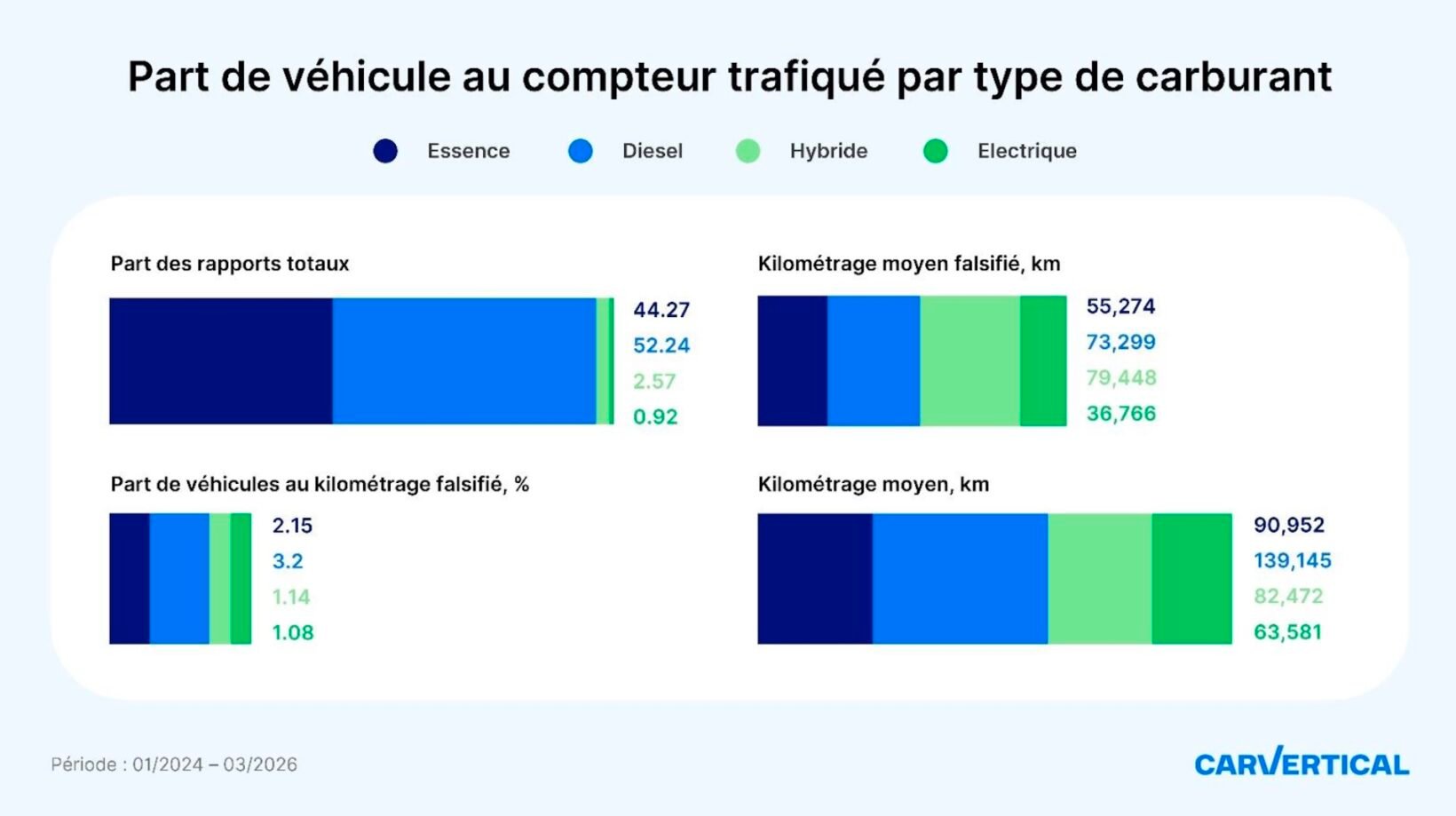 La fraude au compteur kilométrique n’est pas un mythe. Chaque année, des milliers de véhicules sont concernés en France… Si les motorisations thermiques restent les plus touchées en proportion, la photographie du marché évolue. Selon les données analysées par carVertical, environ 3,2 % des modèles diesel présentent une anomalie de kilométrage, contre 2,2 % pour les véhicules essence. Les voitures hybrides (les auteurs ne précisent pas s’il s’agit de HEV, MHEV ou de PHEV) apparaissent encore moins touchées en fréquence, avec un taux d’environ 1,14 %. La part des voitures 100 % électriques d’occasion touchées est encore plus faible (1,08 %).