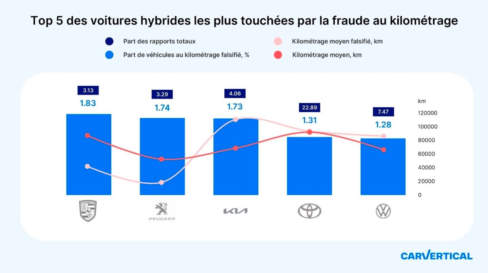 Côté hybrides, Porsche arrive en tête (1,83 %), devant Peugeot (1,74 %), Kia (1,73 %), Toyota (1,31 %) et Volkswagen (1,28 %). Encore une fois, ces chiffres qui ne signifient pas forcément que les constructeurs mentionnés sont moins fiables que les autres, mais plutôt que leurs modèles sont certainement davantage présents sur le marché de l’occasion ou plus ciblés par certaines pratiques frauduleuses.