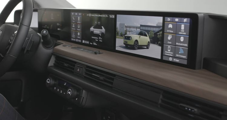 Attendue dans sa version définitive en septembre au salon de Francfort, la petite Honda e détaille son impressionnant tableau de bord panoramique à 5 écrans.