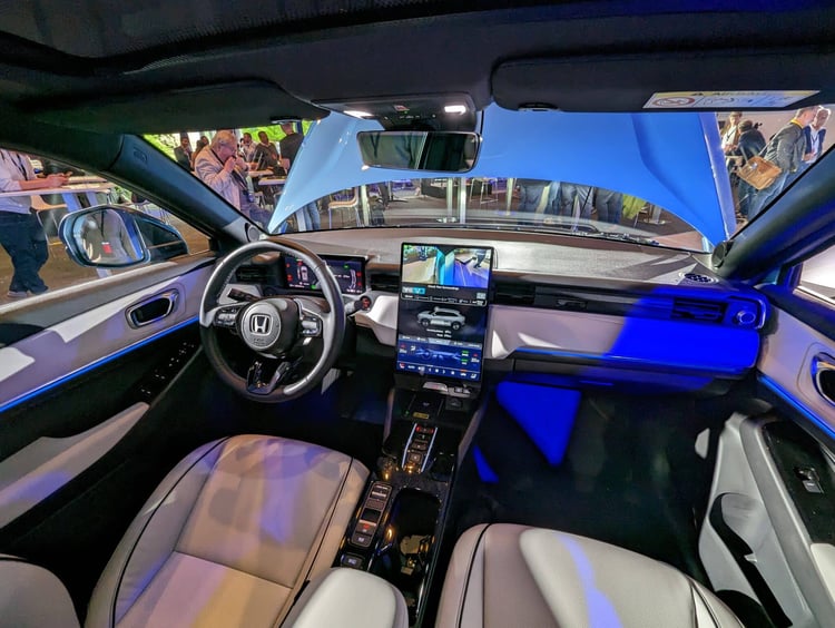 À l’avant, le Honda HR-V qui sert de base n’est plus reconnaissable. Si le coup de crayon général est conservé, le Honda e:Ny1 se démarque par l’apparition de nouvel écran et d’une console centrale remaniée. Le combiné d’instrumentation numérique demeure, mais se débarrasse de la traditionnelle casquette moussée. La console centrale se montre plus simple et fait l’impasse sur le levier de vitesse, cher à la clientèle japonaise, au profit de boutons plus modernes.