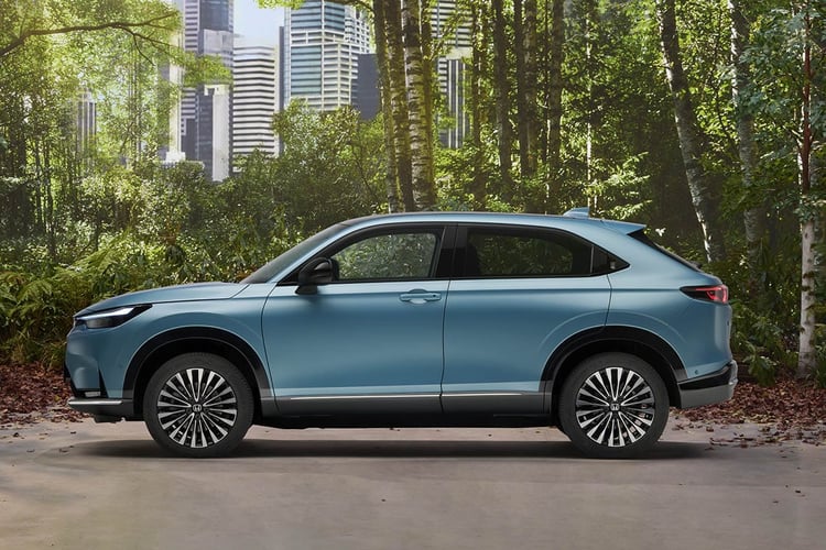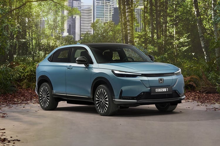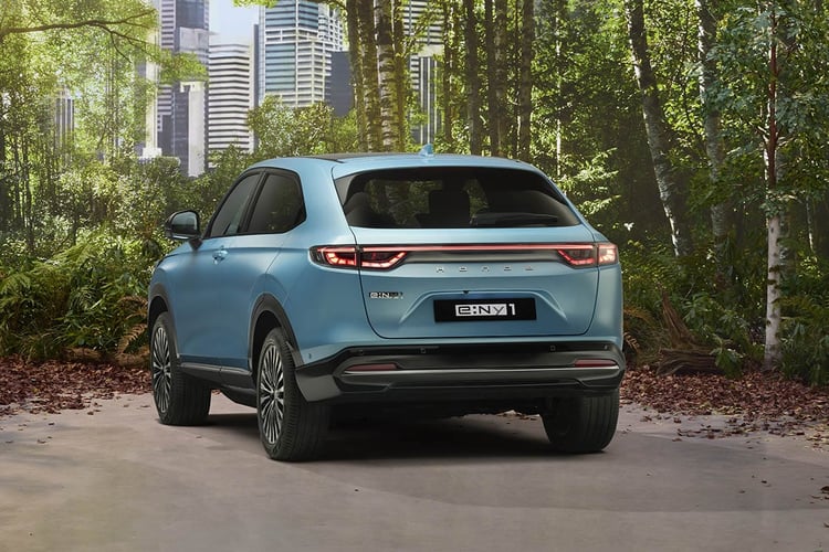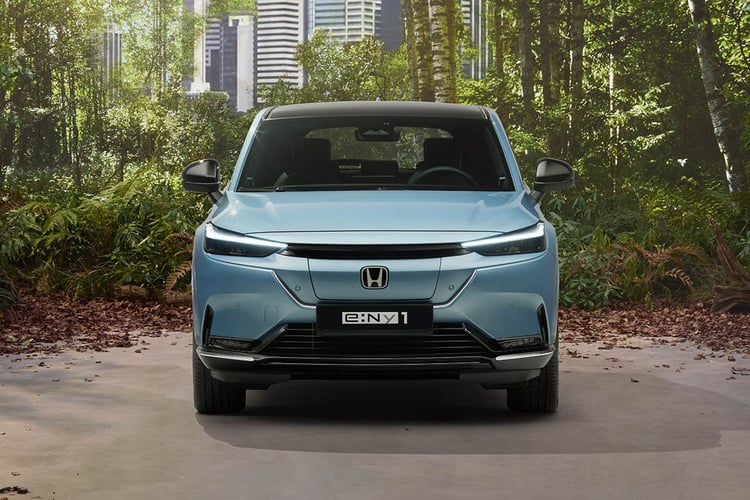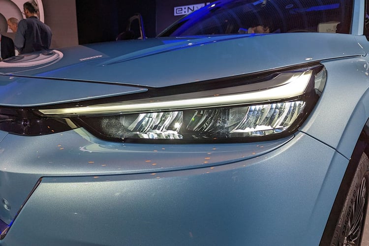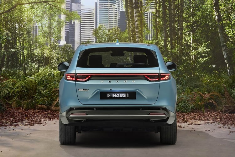Le Honda e:Ny1 est donc une proche copie du HR-V uniquement disponible avec une motorisation hybride. À l’exception de quelques détails cosmétiques, à l’image de la calandre pleine, le SUV électrique ressemble comme deux gouttes d’eau à son frère. Il présente aussi des dimensions proches, avec une longueur totale de 4,39 m à peine augmentée (+ 5 cm), pour un empattement inchangé de 2,61 m. Il présente cependant une hauteur supérieure de 2 cm en raison de la garde au sol, déjà importante (19,5 cm), surélevée pour embarquer la batterie sous le plancher.