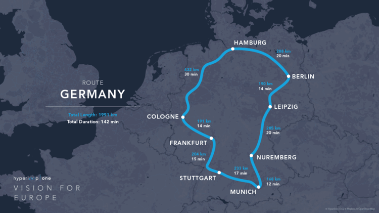 Pour Hyperloop One, il s’agit de faire la d’imaginer ce à quoi pourrait ressembler son futur réseau européen qui repose sur un système de capsules capables de transporter passagers et marchandises à plus de 1000 km/h dans des tubes à très basse pression. Ainsi, seules 142 minutes suffiraient pour parcourir les près de 2000 kilomètres qui séparent les principales villes allemandes.