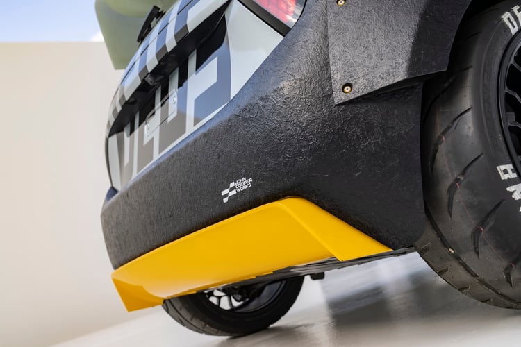 Le look fait dans le tape-à-l’oeil, que ce soit pour les couleurs retenues (un assemblage de gris argent, de noir et de jaune pétant) que des ajouts sur la carrosserie, à commencer par les grands élargisseurs d’ailes pour abriter les larges pneus. Des éléments sont réalisés en fibre de verre, clin d’oeil appuyé aux planches de surf. L’aileron qui vient entourer la lunette a la même inspiration.