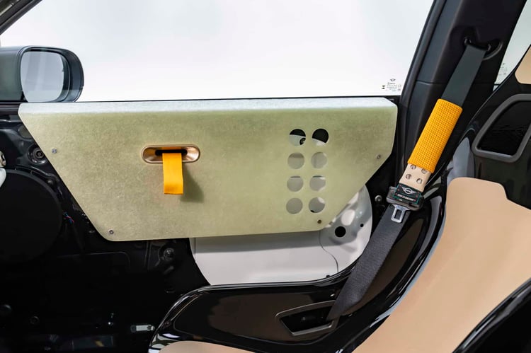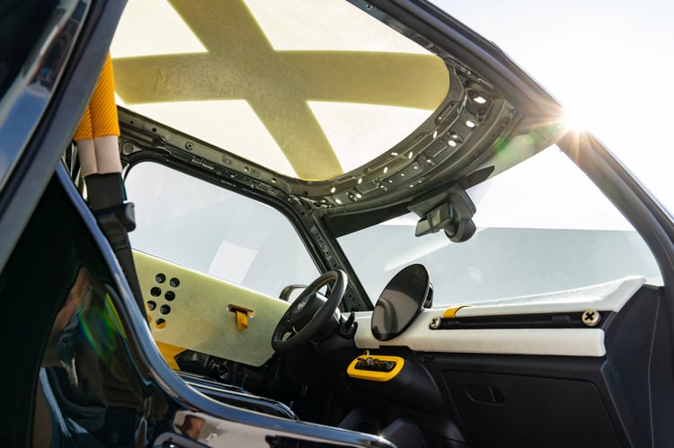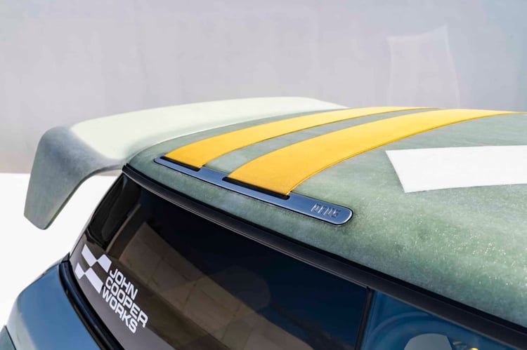 Des sangles sont visibles sur le toit, référence cette fois à celles que l’on voit sur la planche de bord des nouvelles Mini. On ne peut aussi manquer le grand X, une manière de rappeler la coopération entre deux entreprises (dans le jargon marketing tendance, on place le x entre les deux marques pour signifier une collab).