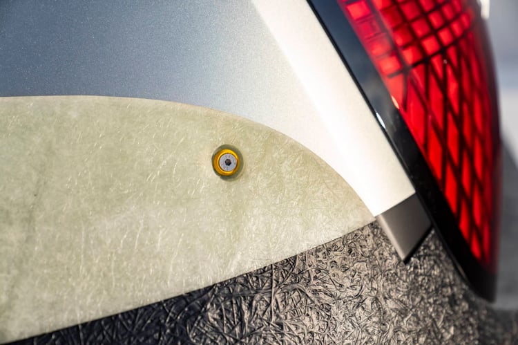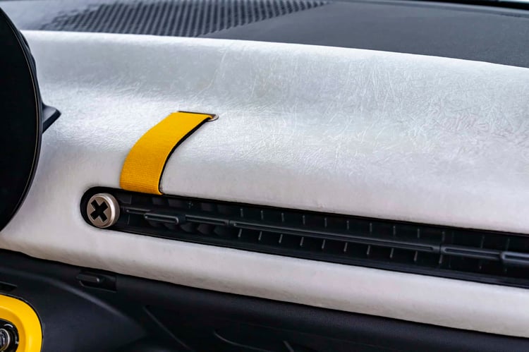 A l’intérieur, les références à l’univers surf se poursuivent, avec des sièges baquets revêtus de néoprène, comme les combinaisons. Les sangles que l’on voyait sur le toit se poursuivent dedans pour permettre de ranger les planches au plafond. Le tableau de bord utilise aussi la fibre de verre.