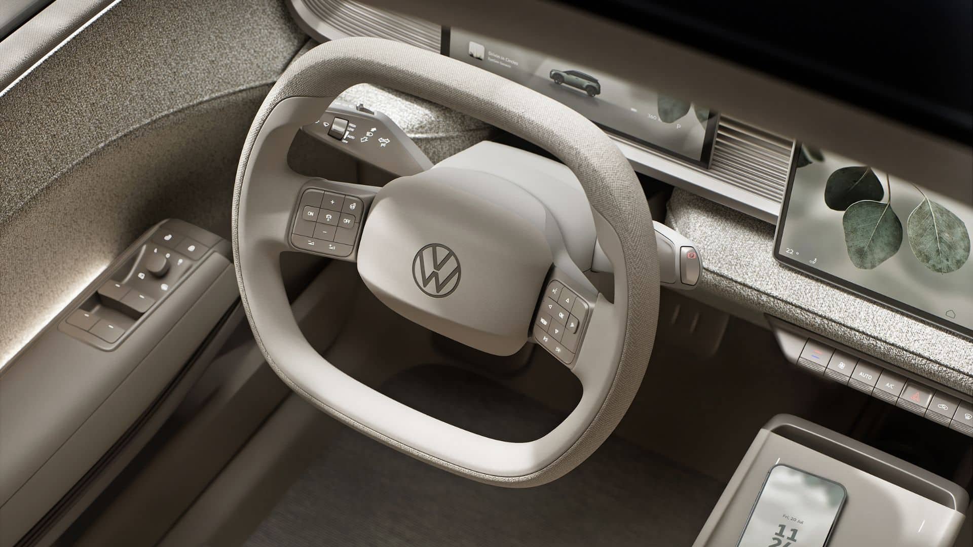 La console centrale, qui sera moins flottante sur le Volkswagen ID.Cross final, portera en revanche de quoi charger un (des ?) smartphone(s) par induction. Le concept s’amuse à imaginer une fonction. Posez votre téléphone avec l’écran vers le haut : l’affichage et l’ambiance led sera complète. Posez-le dans le sens contraire (comme vous le feriez au restaurant si vous êtes une personne polie) : ceci active un « mode calme », réduisant les infos à la vitesse. Futé, mais improbable sur le véhicule de série.
