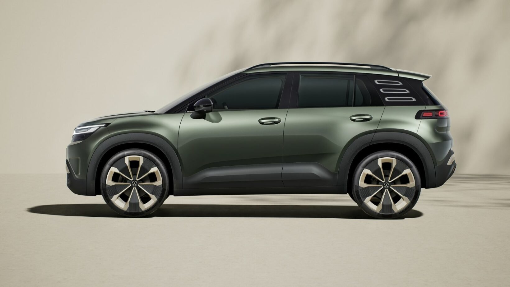 Tentons donc de déchiffrer. De grandes surfaces laissées à la tôlerie, des lignes horizontales pures, l’usage des leds plutôt que des chromes. Dans la tradition VW, le montant C est costaud. Mais la découpe de la fenêtre est anguleuse, là où celle de l’ID.Polo est plus souple. La zone est habillée par trois inserts en gélules horizontaux, clin d’œil à l’ID.Buzz… qui se réfère lui-même au Combi. Le toit, couleur carrosserie, repose sur des montants peints en noir.