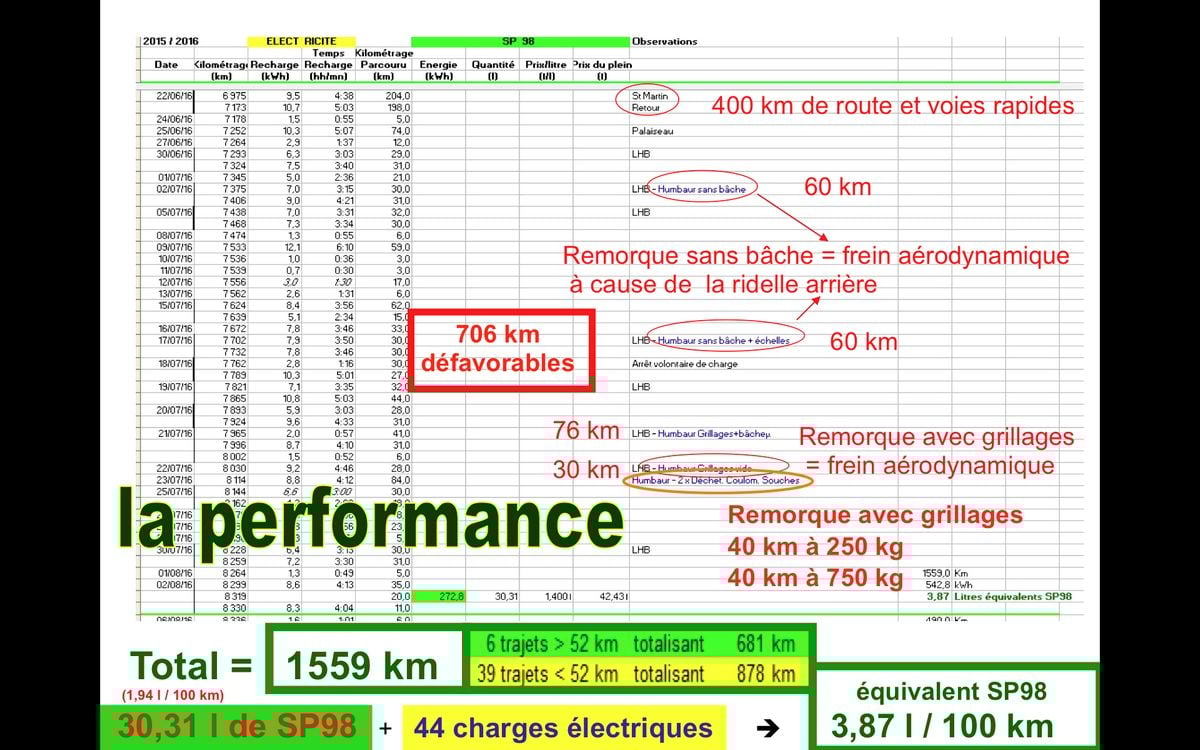 Le tout représente 1.559 km, obtenus avec 30,31 l de SP98 + 44 recharges de la batterie. La consommation moyenne en essence s’établit à 1,94 l/100 km. Et si l’on ramène toute la consommation énergétique en litres d’essence (1 litre d’essence = environ 9 kWh), on trouve l’équivalent de 3,87 l de SP98 aux 100 km. Pour conclure, l’ancien ingénieur donne sa recette pour une sobriété énergétique en mobilité quand il n’est pas possible de se passer d’une voiture : 1 véhicule performant et efficace + 1 conducteur qui pratique l’éco-conduite + le choix du parcours le plus adapté à l’efficacité énergétique.