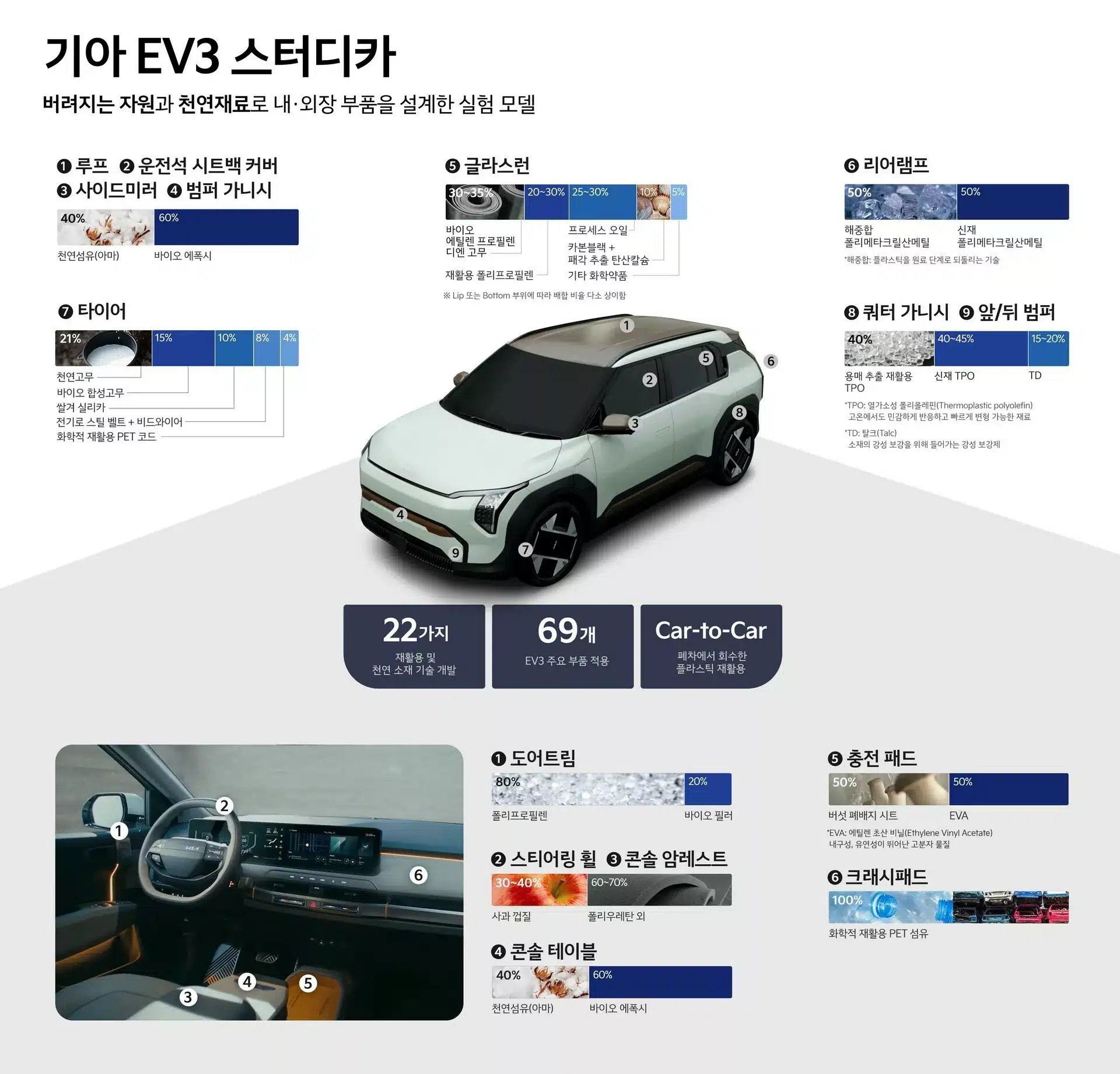 Kia a intégré des matériaux naturels ou recyclés à l’intérieur comme à l’extérieur. Certaines parties de la carrosserie, notamment les pare-chocs et le hayon, ont été fabriquées à partir d’un plastique récupéré sur des véhicules mis au rebut. Ils sont « soudés » avec un composite qui utilise des fibres naturelles ainsi que des biopolymères. Ce matériau est aussi utilisé sur le toit, le spoiler arrière et les coques de rétroviseurs.