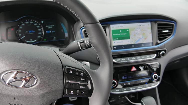 Le trajet long de 93 km est parcouru en adoptant une conduite normale. Nous en profitions pour tester les différents assistants à la conduite et notamment l’aide au maintien de voie. Associée au régulateur de vitesse adaptatif, elle permet de rendre le pilotage presque autonome. La Ioniq Plug-In accélère et décélère toute seule en fonction des véhicules qui la précède et négocie les virages automatiquement à condition de maintenir les mains sur le volant à intervalles réguliers.