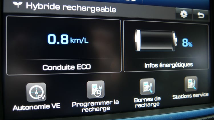 Arrivé à Chartres, les performances affichées par le véhicule sont plutôt satisfaisantes. L’autonomie réelle de 55 km en tout-électrique n’est pas sensiblement différente de celle annoncée par le cycle NEDC (63 km). Il reste encore 15% de batterie au terme de ce trajet long de 64,8 km parcourus en 1h20 à une vitesse moyenne de 51 km/h. D’après l’ordinateur de bord, la conduite a été « 87% écologique et 13% normale » et la consommation de carburant de 0,8L/100 km.