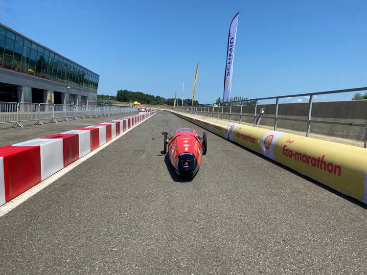 1 000 km avec 1 kWh ? C’est possible au Shell Eco Marathon électriqueJ’ai le droit à deux tours. Le premier, pour se familiariser avec l’engin… et le circuit. Mon erreur de débutant du jour a été de ne pas assez repérer le tracé. Avec ces meurtrières, j’ai l’impression de naviguer à vue. Ce qui me pousse à vouloir me redresser légèrement, un excellent exercice pour se faire les abdos (je l’ai senti pendant 24 heures).