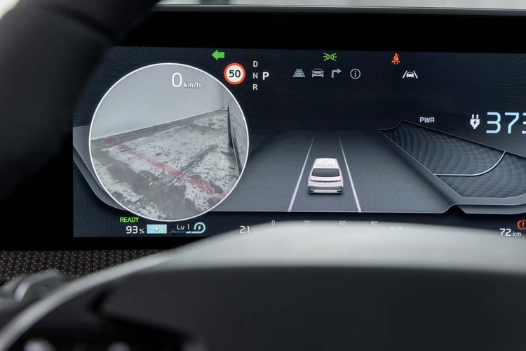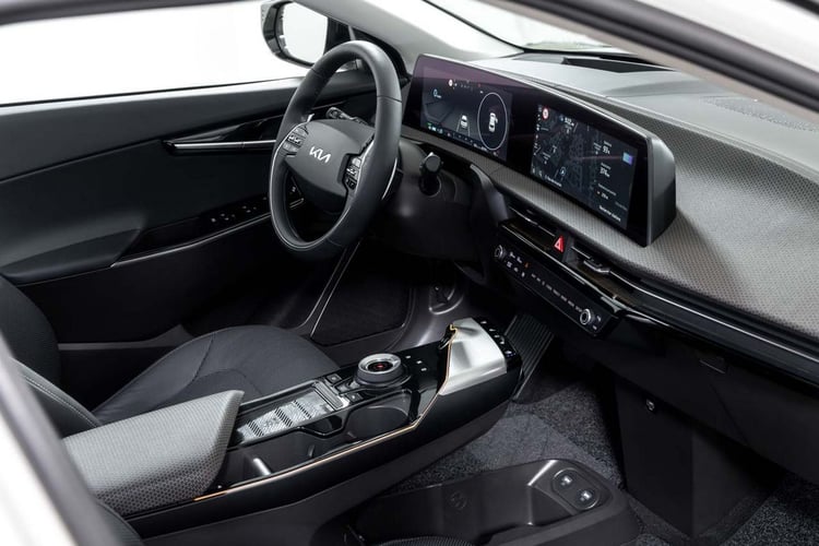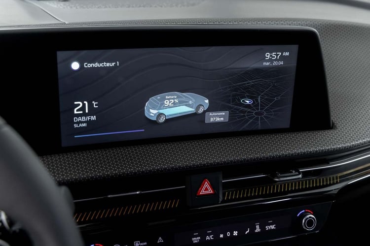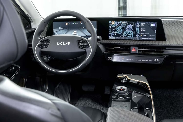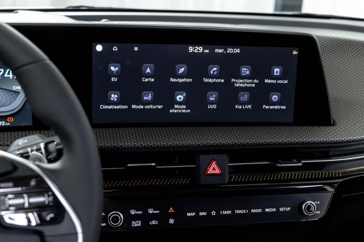 Aux places avant, cette Kia EV6 offre une présentation très moderne avec ses deux écrans de 12,3 pouces incurvés. Complété par un dispositif d’affichage tête haute très pratique, le premier fait office d’instrumentation tandis que le second est dédié au système multimédia. À la fois fluide et réactif, celui-ci intègre la navigation avec la géolocalisation des points de charge. La compatibilité avec les dispositifs Apple CarPlay et Android Auto est également au rendez-vous.