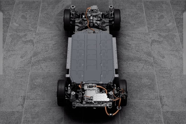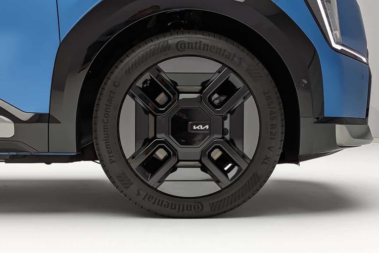 Le Kia EV9 embarque une batterie qualifiée de quatrième génération. Il s’agit d’une unité inédite d’un capacité utile totale de 99,8 kWh, ce qui en fait l’une des plus importante sur le marché à l’heure actuelle. Elle est composée de 456 cellules poches fournies par SK On, et réparties en 38 modules. L’ensemble propose une tension totale d’un peu moins 800 Volts. Elle alimentera au choix une ou deux machines électriques en fonction de la configuration retenue. Dans le premier cas, l’EV9 dispose d’une machine arrière d’une puissance totale de 204 ch pour 350 Nm de couple. Contre toute attente, la valeur de puissance est ici moins importante (mais le couple est inchangé) qu’à bord de la plus petite Kia EV6 RWD, et identique à celle d’un Niro EV. Ainsi configuré, le SUV ne sera pas le plus véloce avec un 0-100 km/h en 9,4 s. Les plus pressés apprécieront sans doute la version à transmission intégrale, qui cumule 385 ch pour 200 Nm à l’avant et 350 Nm à l’arrière. La vitesse de pointe grimpe à 200 km/h (contre 185 km/h) mais les accélérations sont plus vives avec 6,0 s pour atteindre 100 km/h.