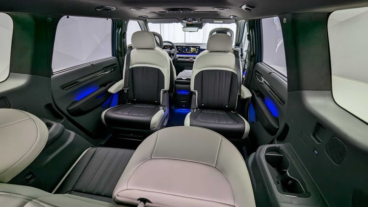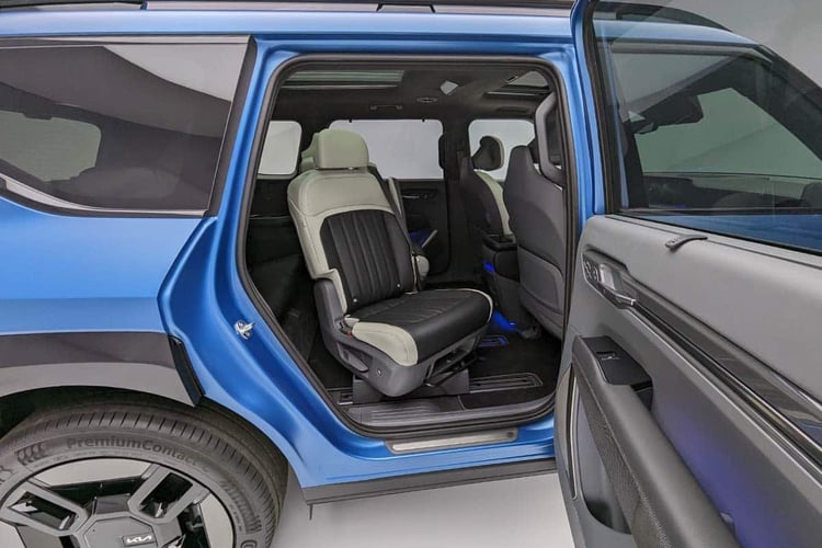 Skoda Vision 7S : on est monté à bord du SUV électrique à 7 placesLe Kia EV9 propose aussi une originale configuration à 6 places. A l’instar du Tesla Model X, la rangée centrale présente deux sièges indépendants. Ils disposent cependant d’une inédite fonction qui permet de les faire pivoter à l’aide d’une tirette. Vers l’extérieur, ils peuvent tourner sur un angle de 90° pour faciliter l’accès à bord. Vers l’intérieur, ils peuvent pivoter sur un angle de 180° pour se tourner face aux passagers un arrière. Dans cette configuration, l’EV9, n’a presque plus rien à envier à une navette de transport de personne. Cependant, la cinématique n’est possible qu’à l’arrêt et faire tourner le siège vers l’intérieur n’est pas des plus facile. Enfin, si l’accoudoir est bien placé en temps normal, il fait doublon avec celui de la porte lorsque le siège est retourné, et le bras droit se retrouve dans le vide.