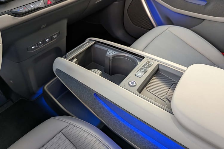 Par rapport aux autres modèles électriques de la gamme, le poste de conduite change de forme et présente un nouveau coup de crayon. Si l’architecture globale est similaire avec une dalle numérique posée derrière le volant, l’atmosphère ne s’inspire pas de celle d’une Kia EV6. L’affichage numérique se compose de deux dalles de 12,3 pouces dédiées à l’instrumentation et au système d’info divertissement. Les graphismes des écrans, plus modernes, marquent la rupture avec ce qu’on a l’habitude de voir sur l’ensemble des voitures du groupe. On y retrouve aussi un panneau tactile intermédiaire de 5,1 pouces. Intuitive, cette commende n’est toutefois pas idéalement placée : la jante du volant cache les informations et il est nécessaire de se pencher pour affiner les réglages de la climatisation. Surtout, elle est de trop dans cet habitacle, puisque le véhicule propose également des commandes physiques pour régler le confort thermique à bord, en plus d’un menu complet via l’écran central…