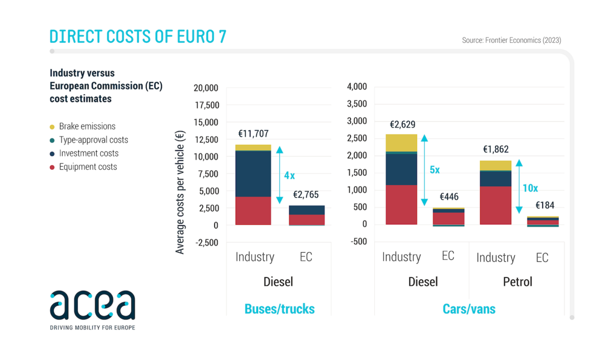 Selon une étude commandée par l’Association des constructeurs européens d’automobiles (ACEA) et réalisée par Frontier Economics, le coût direct par véhicule pour les voitures et les utilitaires à moteur thermique pour leur permettre de satisfaire la norme Euro 7 serait de 1 862 € pour l’essence et de 2 629 € pour le diesel, ce qui représente respectivement 10 et 5 fois plus que les estimations officielles de la Commission Européenne. De plus, celui concernant les camions et les bus à moteur diesel s’élève à un montant de 11 707 € par véhicule, soit 4 fois plus que le chiffre initialement suggéré.