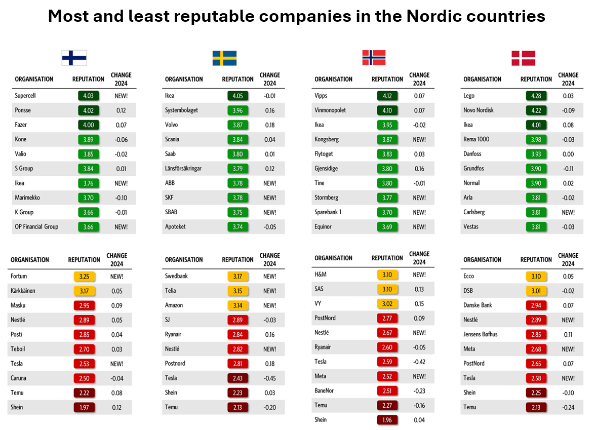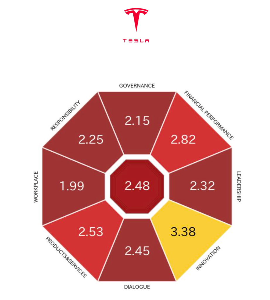 La note est établie sur cinq points, en fonction de huit critères : innovation, dialogue, produits et services, lieu de travail, responsabilité, gouvernance, performance financière, direction / leadership. Une note inférieure à 2,5 est considérée comme très mauvaise. C’est ce qu’obtient Tesla en Allemagne et en Suède. Et à peine mieux dans les deux autres pays : 2,53 en Finlande, 2,59 en Norvège. Tesla arrive ainsi bon dernier en Allemagne et dans les cinq derniers dans les autres pays.