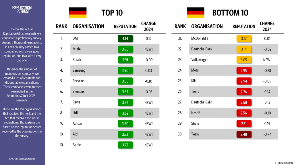 Gigafactory de Berlin : Tesla peut-il encore justifier une production en Allemagne ?L’enquête menée par le cabinet finlandais Reputation and Trust Analystics concerne la réputation des marques en Allemagne, Suède, Norvège, Danemark et Finlande. Cinq marchés importants pour Tesla, et sur lesquels le verdict est sans appel. Son image sombre dans le fond des classements.
