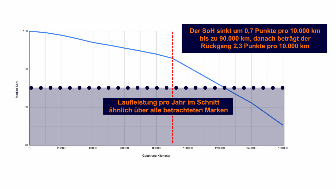 En effet, au-delà de 90 000 kilomètres, la dégradation moyenne passe à 2,3 points de pourcentage tous les 10 000 kilomètres, soit plus de trois fois le rythme observé auparavant. À titre d’illustration, une batterie située à 94 % de SoH à 90 000 kilomètres pourrait ainsi descendre sous les 85 % aux alentours de 130 000 kilomètres si cette tendance se confirme. Ça peut piquer… mais si on prend en compte un kilométrage annuel de 15 000 km, cela fait plus de 8 ans, ce qui est donc acceptable !