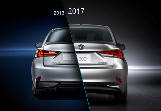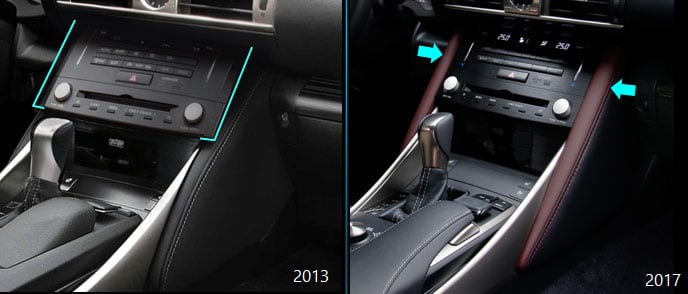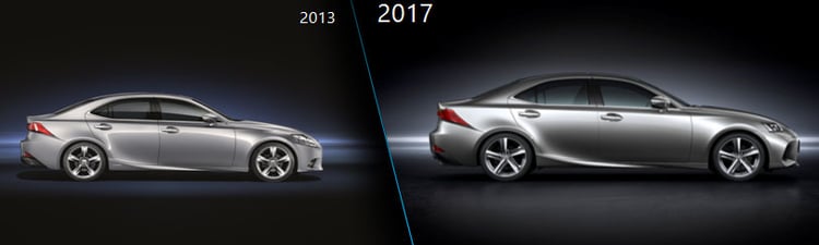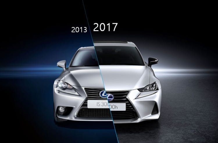 Si l’IS avait été largement revue en 2013, les modifications esthétiques de cette version 2017 sont beaucoup plus subtiles et même parfois difficiles à percevoir, et cela même en mettant les deux véhicules côte à côte comme dans les plans coupés ci-dessous. Légèrement revue, la calandre accueille de nouvelles optiques, plus adoucies, des entrées élargies et une petite évolution de la calandre trapézoïdale propre à la marque.