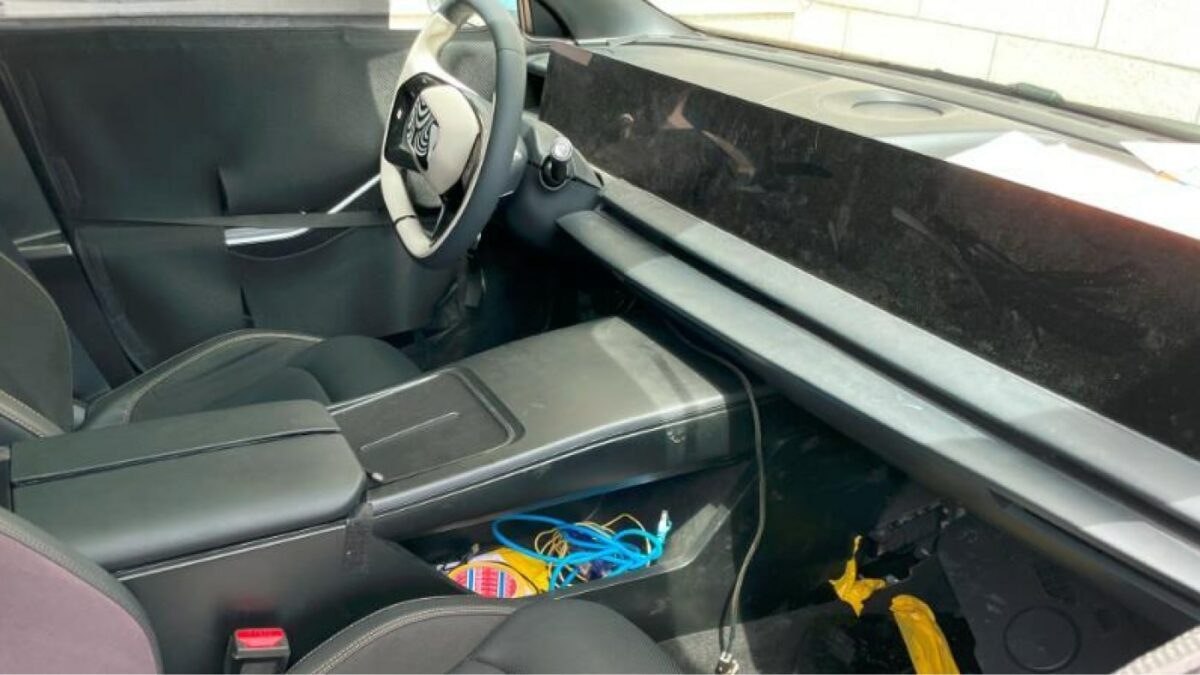 L’accoudoir central semble inachevé. Sur la photo, on constate qu’il dispose d’un espace de recharge pour deux smartphones et d’un compartiment spacieux. L’écran d’un mètre de long monté sur la console centrale est assez spectaculaire. Il ne s’agit a priori pas d’un bloc de plusieurs écrans assemblés derrière une vitre, mais d’un seul écran massif. Il mesure précisément 1 130 mm de long sur 138 mm de haut. Une diagonale de 45 pouces.