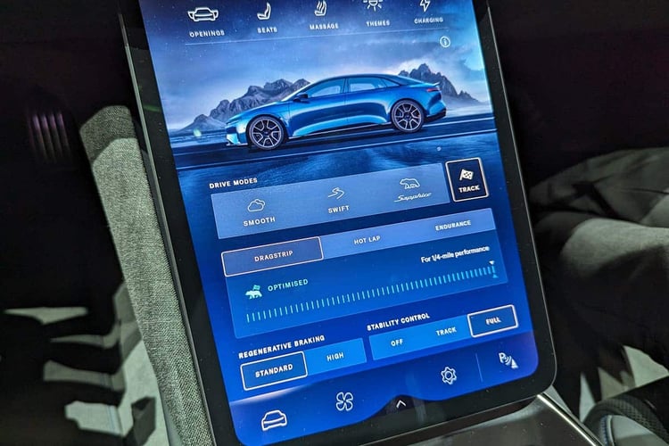 C’est depuis cette dernière dalle que le conducteur pourra aussi choisir les modes de conduite. Les modes Smooth et Swift repris de la Air civile demeurent, et limitent la puissance à près de 780 ch. Le mode Sapphire, équivalent du mode Sport qui remplace le mode Sprint, laisse passer près de 1 140 ch. Enfin, le mode Track donne accès aux trois sous-modes Drag-Strip, Hotlap et Endurance. Jouant sur les paramétrages électroniques et sur le Torque Vectoring, ces configurations limitent la puissance en fonction des besoins. Le mode Endurance, prévu pour allonger les sessions sur piste, n’autorise que 780 ch. Le mode Hotlap, pensé pour claquer des chronos, donne jusqu’à 1 000 ch. Enfin, c’est en mode Drag que toute la cavalerie est convoquée.