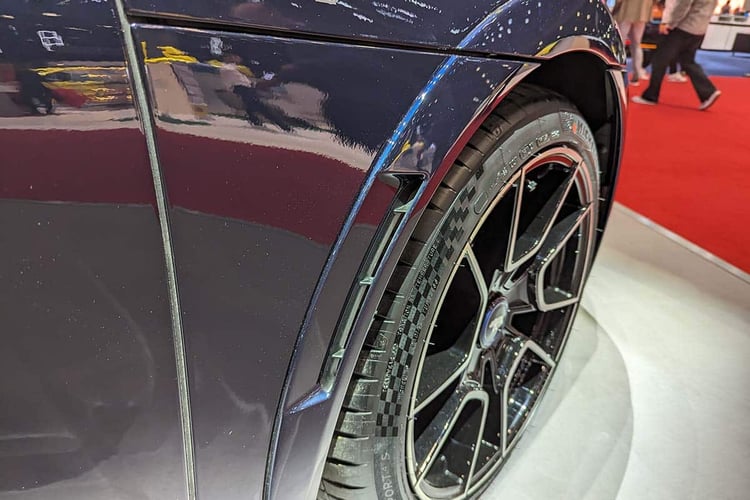 Le châssis n’a pas été oublié face aux nombreuses améliorations électroniques. Paradoxalement, cet engin qui veut être le pinacle de la technologie recourt toujours à suspension classique, mais dispose maintenant de ressorts plus rigides et de nouveaux amortisseurs. Le véhicule repose désormais sur des pneus Michelin Pilot Sport Cup 2 spécifiques (marquage LM1) de 265/35 R20 à l’avant et de 295/30 R21 à l’arrière. Des grosses gommes, qui imposent l’installation d’élargiseurs d’ailes aux quatre coins. A noter que ces derniers participent aux performances aérodynamiques, tout comme la queue de canard en carbone, bien plus imposante en vrai que sur les premières images de présentation. Sous le châssis se cachent de nouveaux déflecteurs permettant de mieux diriger l’air sous le plancher plat.
