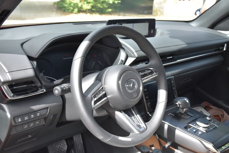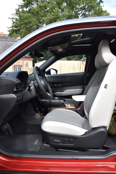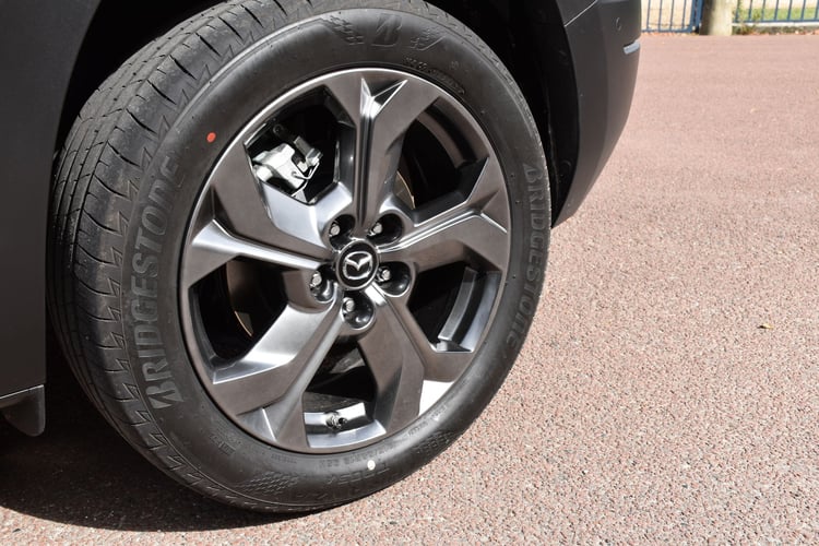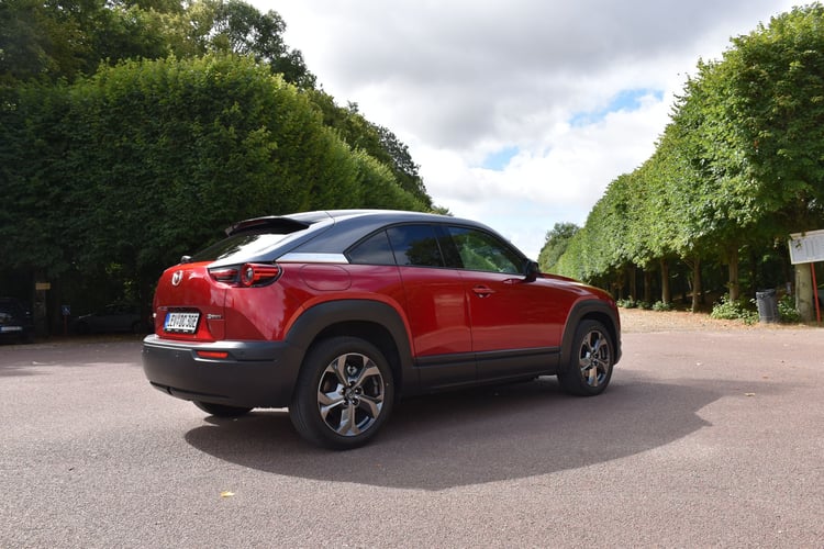 Bien qu’imposant, le MX-30 ne revendique pas une puissance démesurée. Il respecte la sobriété japonaise, avec un moteur 107 kW/145 chevaux et un couple grimpant jusqu’à 271 Nm. Par contre, pas de 4 roues motrices, tout passe aux roues avant. Malgré l’approche « l’ennemi, c’est le poids », en conduite, les 1.645 kg se sentent. Avec un 0-100 km assuré en plus de 9 secondes, nous ne sommes pas en présence d’un sportif, c’est certain. En revanche, la Mazda électrique reste bien collée au bitume, avec son centre de gravité bas, mais une légère tendance au sous-virage. De leur côté, les suspensions donneraient à mieux gommer les imperfections des petites routes de campagnes.