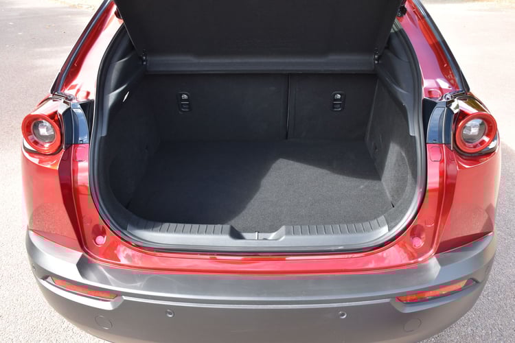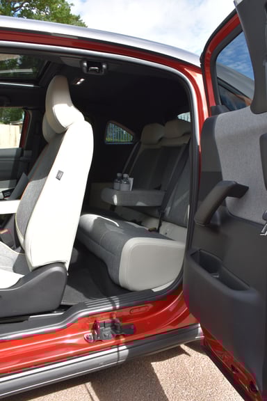 Le Mazda MX-30 est donc la version électrique du CX-30 à moteurs thermiques essence et diesel. Mais c’est plus que cela. La carrosserie est complètement à part, avec une allure de coupé, en conservant 5 portes. Les portes sont antagonistes, comme sur la sportive RX-8 ou la BMW i3. Sans pied central et à ouverture à 80 degrés, elles permettent un accès très aisé aux places arrière. Par contre, il ne faut pas être trop claustrophobe, car l’espace n’est pas vaste. Le vitrage est limité, même avec le toit ouvrant qui ne couvre que les places avant. Le coffre n’apporte qu’un volume de 341 litres, c’est peu pour un SUV de cette taille. Il a tout de même le mérite d’avoir un seuil bas et un plancher quasi-plat avec les sièges rabattus.