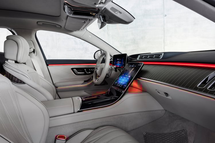 La Mercedes C63 AMG fait sa révolution et devient hybride rechargeablePour que ce pachyderme ait un comportement qui soit sportif, il reçoit en série les roues arrière directrices et une suspension pneumatique qui intègre une compensation active du roulis. Le système de freinage est adapté, avec des disques de 400 mm à l’avant et 380 mm à l’arrière. Mais il ne faut pas oublier que c’est une Classe S, la limousine de Mercedes. La voiture fait donc le plein d’assistances à la conduite, avec la promesse d’une conduite autonome de niveau 3 grâce à un Lidar.