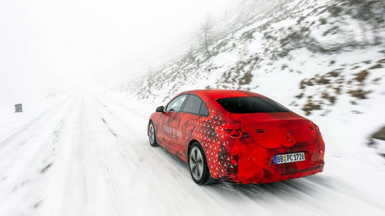 On devine déjà à travers le camouflage la calandre aveugle portant tout de même la caméra vouée aux ADAS ou les feux portant des signatures lumineuses en étoile (cela a été confirmé dans une récente vidéo présentée par le boss, Ola Källenius).
