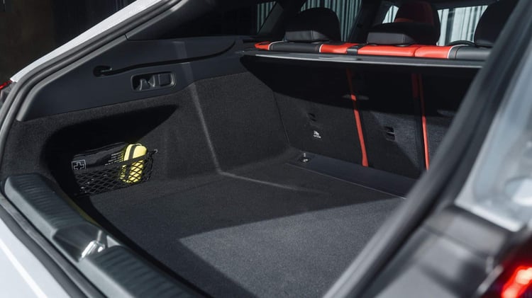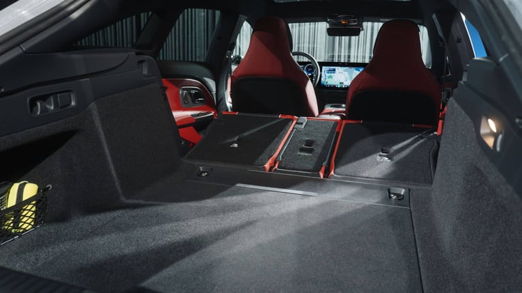 En repliant la banquette arrière, on obtient jusqu’à 1 282 litres de chargement dans la soute. La largeur de l’espace dédié aux bagages est de 1,42 m. L’emport du coffre avant (frunk) demeure logiquement identique à 101 litres.