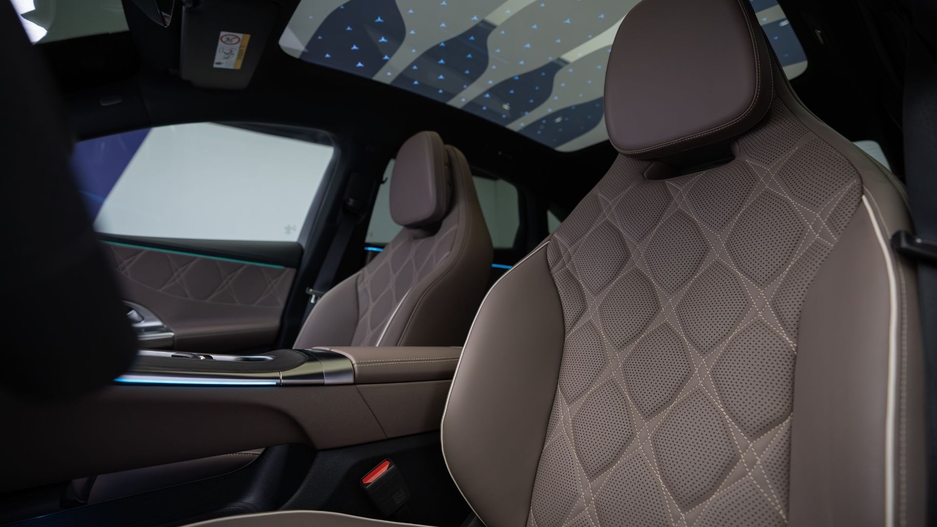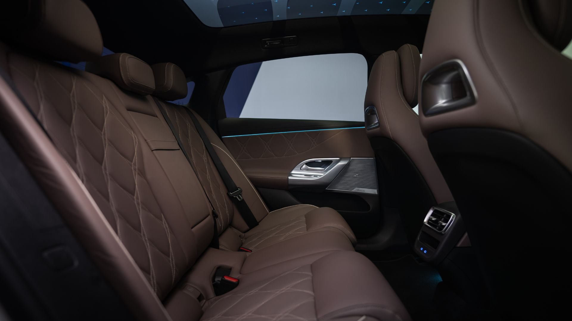 Le bilan est plus nettement satisfaisant aux places arrières. Un adulte trouvera une position confortable, là où la récente BMW i3 incline un peu trop le dossier pour sauver la garde au toit. Le toit est panoramique de série et doté de segments modulables et de 162 étoiles en option. À Stuttgart, on utilise l’appellation Sky Control pour décrire cette dernière déclinaison. Le pavillon ne frise pas trop la tête des passagers s’ils mesurent moins de 1,85 m.