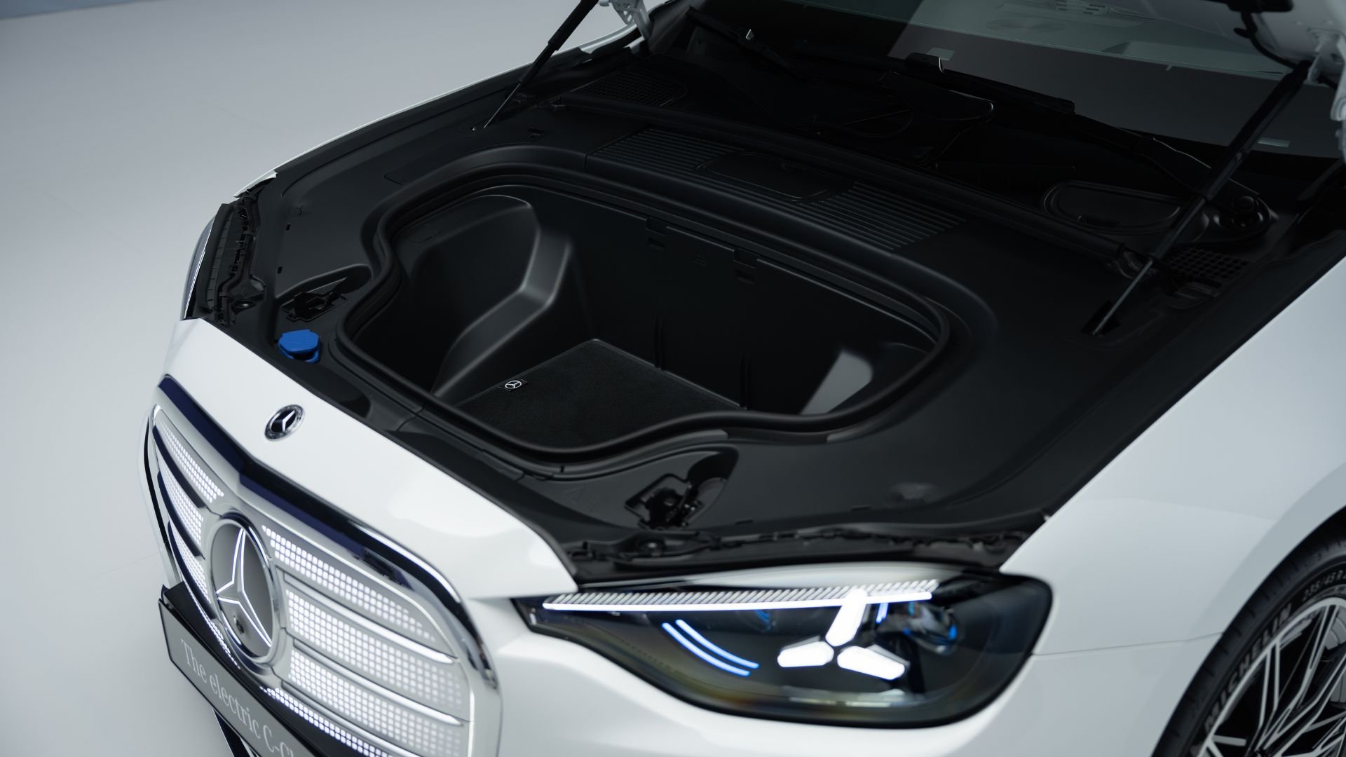 Heureusement, la Classe C dispose d’un coffre avant additionnel. Son volume (liquide) dépasse les 100 litres. Sur notre exemplaire de découverte, ce frunk était garni d’un épais tapis signé d’une étoile. Charmante attention. De là, on voit une face avant ornée d’une calandre chromée aux nombreux points lumineux. Pour la petite histoire, ils sont 1 050.