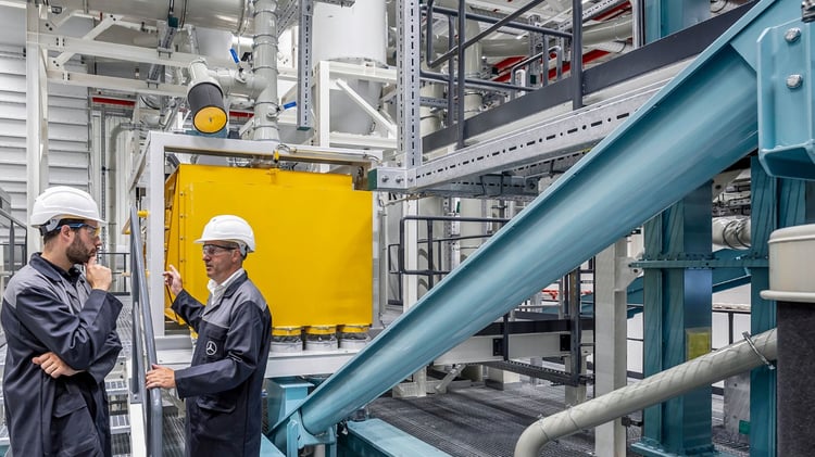 Comment Mercedes veut réduire fortement le prix de ses voitures électriquesGrâce à ces méthodes novatrices, le taux de récupération prévu dépasserait, selon Mercedes, les 96 %, contre moins de 80 % pour les techniques plus traditionnelles comme la pyrométallurgie, très polluante qui plus est. Quant aux moins de 4 % restants, ils sont constitués d’électrolytes. Grâce, de plus, à l’utilisation exclusive d’énergie verte fournie par les panneaux solaires recouvrant les 6 800 m² de toit pour atteindre des températures de processus ne dépassant pas les 80°C, l’avantage écologique est considérable par rapport à se fournir à nouveau en matière première « neuve ». La marque à l’étoile peine à mettre un chiffre dessus, mais cela entraînerait déjà une réduction de l’ordre de 70 % rien que pour les émissions de CO2. Pas plus de volubilité côté économique, mais c’est aussi très intéressant sur cet aspect, suffisamment en tout cas pour faire sortir de terre ce bâtiment dont la construction a coûté « un nombre à deux chiffres de millions d’euros, mais moins de 50 ». Débrouillez-vous avec ça.