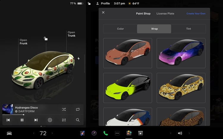 Enfin, vous aurez la possibilité de transformer votre voiture avec le « Light Show ». Un habillage lumineux, soit sur un seul véhicule, soit en synchronisation avec vos amis. Il est également possible de contrôler l’éclairage intérieur ou d’ajouter des effets de couleur à l’affichage. Sans oublier la personnalisation de votre avatar Tesla.